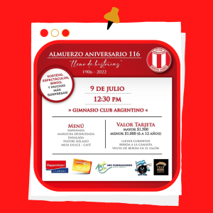 Venta de tarjetas en secretaría de 9 a 17hs de lunes a viernes, sábado 9 de julio de 9 a 12hs