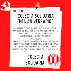 Colecta Te invitamos a colaborar con alimentos no perecederos, zapatillas, y elementos de limpieza que serán destinados a distintas instituciones solidarias de nuestra ciudad.