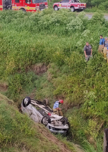Allí, momentos antes, por razones que se intentan esclarecer, un automóvil, conducido por un hombre mayor, sufrió un despiste y un vuelco en solitario, terminando el vehículo con sus ruedas hacia arriba sobre el canal lindero a la carpeta asfáltica.