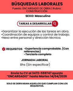 Es para el puesto de Encargado de Obra, y entre los requisitos se destaca que debe tener experiencia comprobable y el terciario completo.
