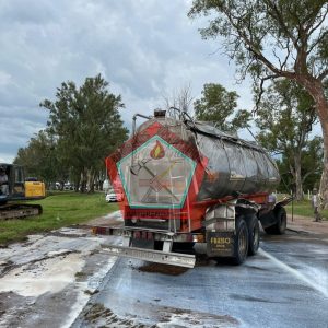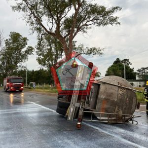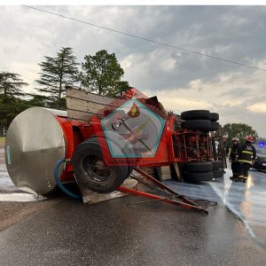 Momentos antes, por razones que se intentan esclarecer, a la altura del kilómetro 211, y en relación a las precipitaciones que azotaban en esa zona, un camión que transportaba leche sufrió el vuelco de su acoplado.