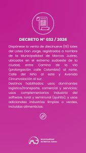 Durante las últimas horas, la Municipalidad de Marcos Juárez dio a conocer la información de que se pondrá a disposición de venta un total de 19 lotes para usos comerciales e industriales. Esto se confirmó a través del decreto 032/2026.