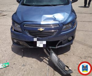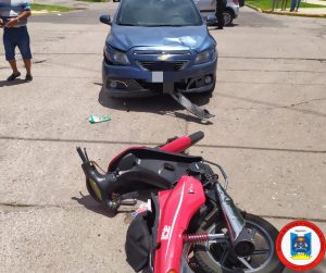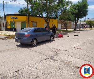 En el dia de la fecha a las 13 horas Bomberos Voluntario de Leones son convocados por un accidente sobre calle Almirante Brown y Bv. Belgrano entre un automóvil y una moto. Al llegar al lugar nos encontramos con una persona sexo femenino, mayor de edad, tendida en el pavimento, quien conducía el rodado menor, la cual fue inmovilizada y trasladada al hospital local con traumatismos graves. Ella circulaba con casco pero por el impacto se le habrá salido.