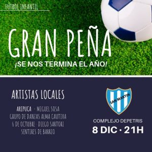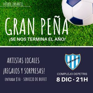 Éste sábado 8 de diciembre, el Fútbol infantil realizará una Gran Peña en el Complejo Depetris con la invitación especial de artistas locales. La cita es a las 21hs. y tiene un costo de $50.