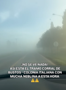 Uno de los vídeos que más se viralizaron fue del tramo entre las localidades de Corral de Bustos y Colonia Italiana, donde la niebla se sintió hasta minutos atrás.
