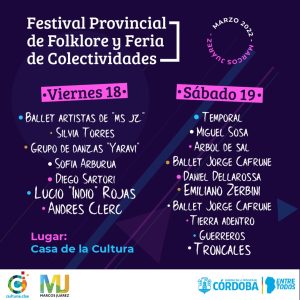 La Dirección de Acción Cultural y Deportiva invita al «Festival Provincial del Folklore y Feria de las Colectividades» a realizarse los días Viernes 18 y Sábado 19 de Marzo a las 21:00 hs en «Casa de la Cultura», calle San Luis y Plaza Perón.Serán dos hermosas noches con artistas provinciales y locales.