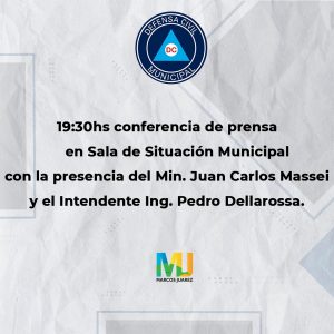 A las 19:30 horas se realizará una conferencia de prensa en la sala de situación con la presencia del ministro Juan Carlos Massei y el Intendente Pedro Dellarossa.