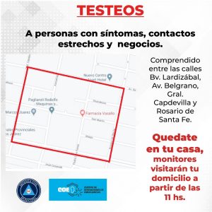 Continúan los testeos de campo en nuestra ciudad. Pedimos a los vecinos/as que vivan en el sector comprendido entre calles Bv. Lardizabal, Av. Belgrano, Gral. Capdevilla y Rosario de Santa Fe que permanezcan en sus domicilios, ya que un promotor de la salud los visitará si son contactos estrechos, tienen síntomas o poseen negocios.