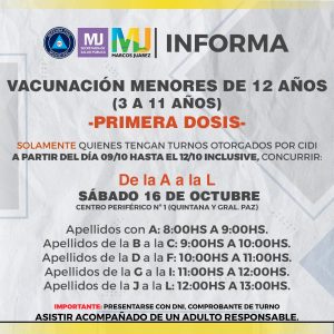 - Sábado 16: (De 8 a 13 horas) 1er dosis menores de 12 años (3 a 11)