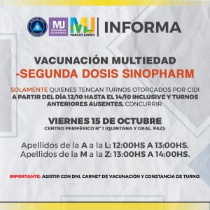 - Viernes 15: (De 12 a 14 horas) 2da dosis Sinopharm mayores de 18 años.