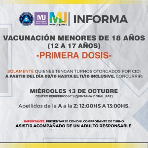 - Miércoles 13: (De 12 a 13 horas) – 1er dosis a menores de 18 años (12 a 17),