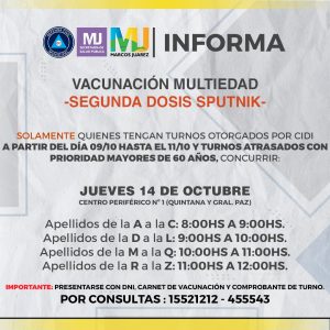 - Jueves 14: (De 8 a 12 horas) – 2da dosis Sputnik a mayores de 18 años.